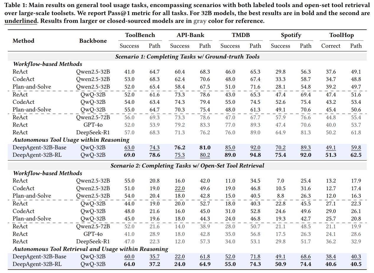 它颠覆了传统智能体的预定义工作流,将思考、工具发现与执行全部融合在一个统自主的推理进程中。通过引入自主记忆折叠机制和端到端强化学习训练方法ToolPO,DeepAgent在8个基准测试中持续超越基线方法,在标注工具和开放集工具检索场景下均表现出色。这项工作为构建更通用、更强大的真实世界智能体迈出了重要一步。