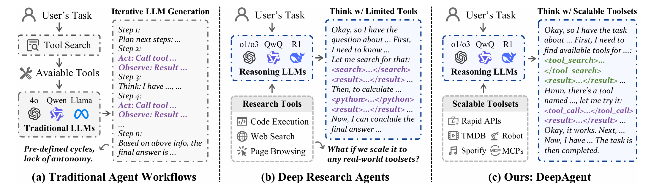 DeepAgent:完全由推理模型驱动,在连续推理中实现端到端任务执行。模型保持对整个任务的全局视角,不受特定孤立操作的约束,工具根据需要动态发现。