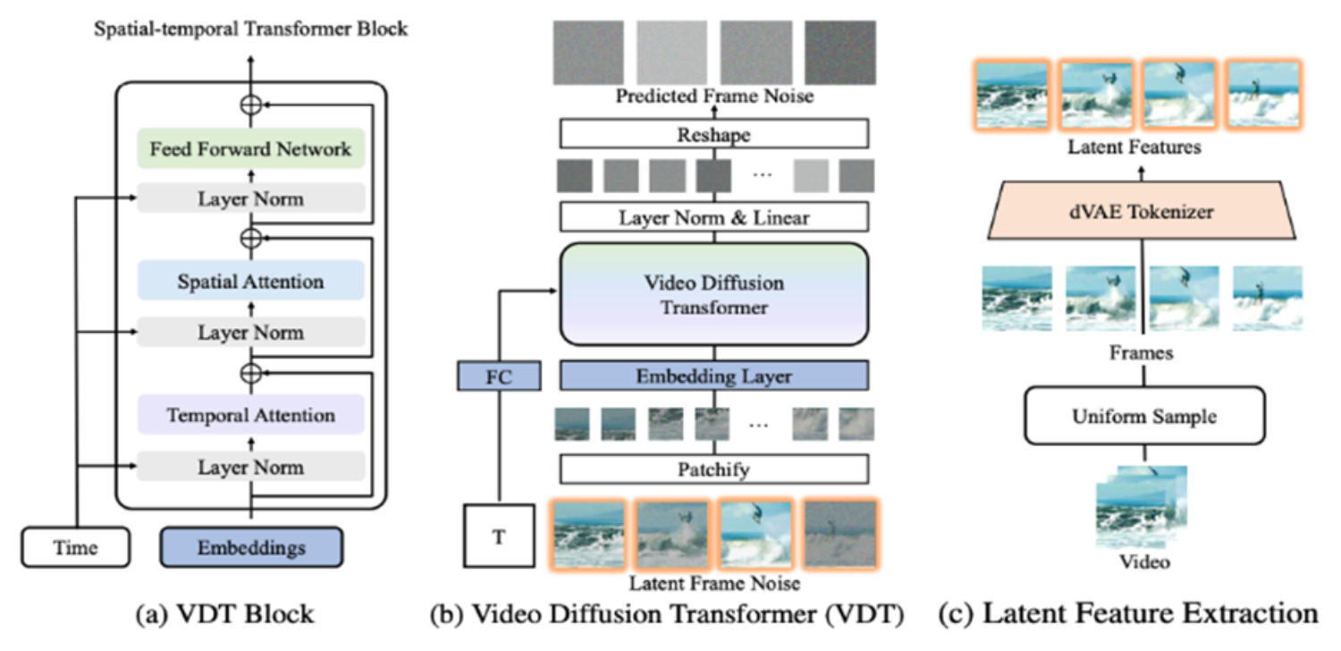 Linear Embedding: Following the approach of Vision Transformers, VDT divides the latent video feature representation into non-overlapping patches of size N×N.