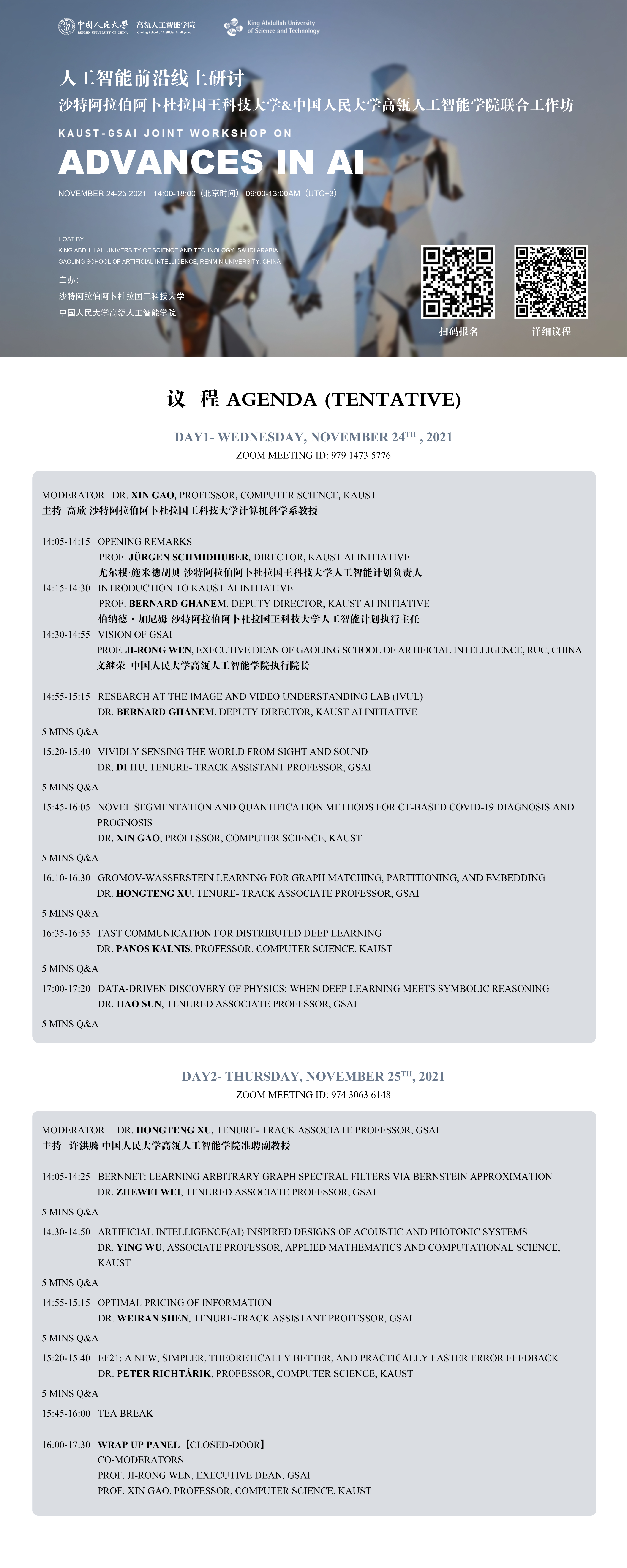 为加强学科前沿国际交流,促进国内外相互借鉴人工智能研究、教育经验,鼓励创新和产业化,形成凝聚广泛共识的人工智能全球对话,2021年11月24-25日,av直播 av直播 (GSAI)与沙特阿拉伯阿卜杜拉国王科技大学(KAUST)AI Initiative将联合举办“人工智能前沿线上研讨”。研讨会将聚焦机器学习理论和算法、人工智能系统、计算经济学以及人工智能在医疗、物理、计算机视觉等领域的前沿应用。