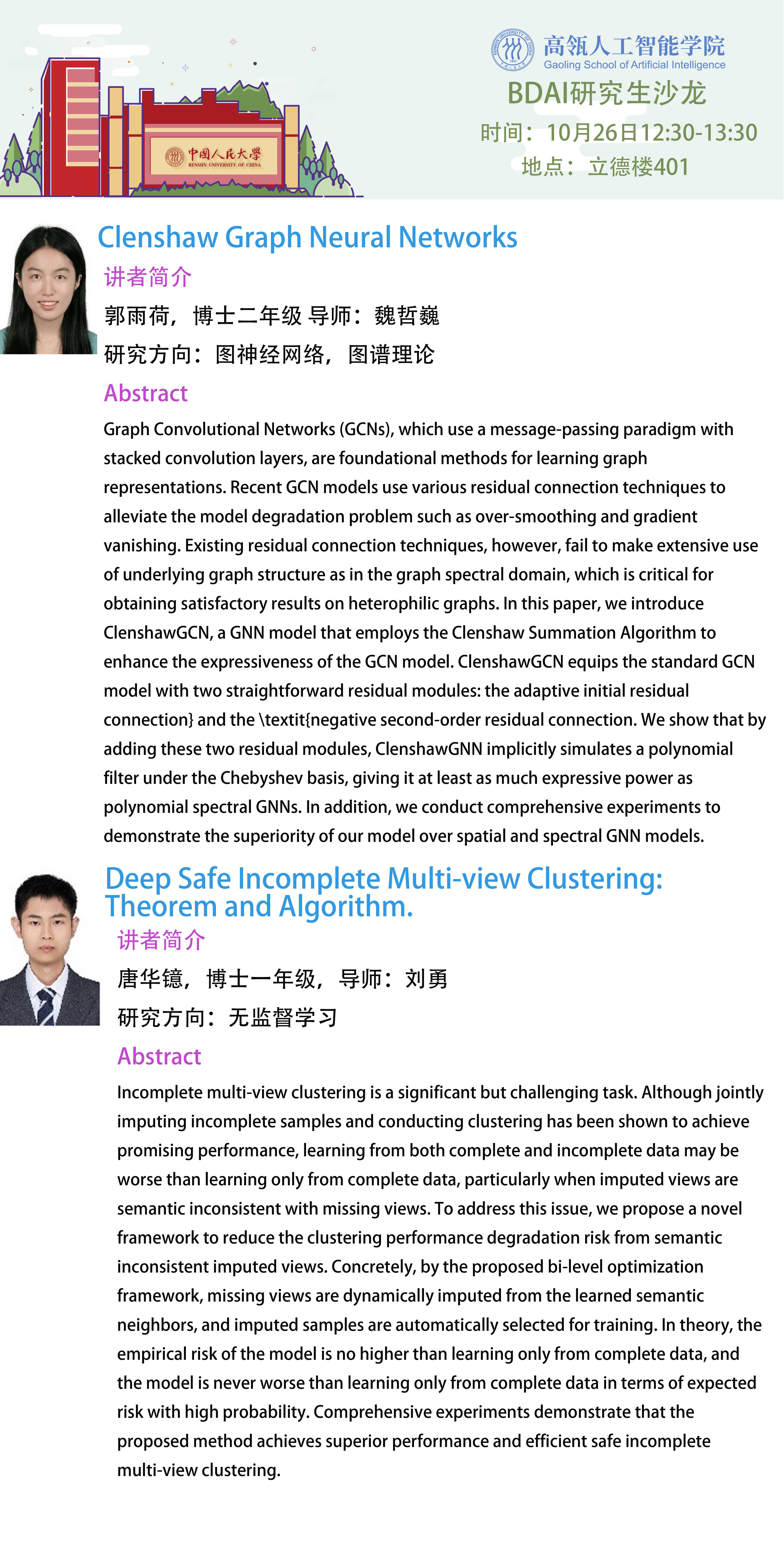 大数据管理与分析方法研究北京市重点实验室(BDAI)研究生沙龙由av直播 av直播 师生组织定期举行。10月26日研讨会由av直播 魏哲巍教授指导的博士生郭雨荷和刘勇准聘副教授指导的博士生唐华镱分别介绍自己的研究工作。欢迎同学们积极参与研讨!