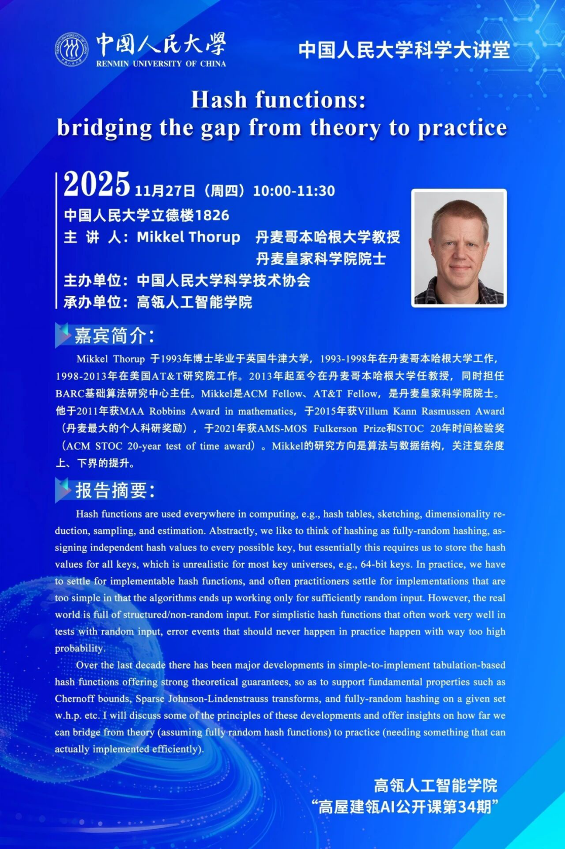 过往十余年内,既往研究工作针对上述问题取得了诸多进展,表格哈希(tabulation hashing)是其中的代表方法,其实现简单且具有良好的理论性质,满足Chernoff bounds、稀疏Johnson-Lindenstrauss变换等,在给定集合上的数学性质与理想的完全随机哈希高概率趋同。本次报告将对相关技术作以介绍,探讨调和哈希函数理论研究与实际应用间背离之处的方法。