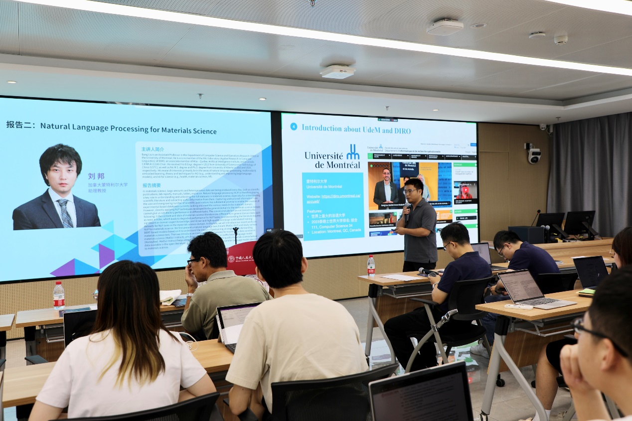 随后,刘邦助理教授进行了题为“材料科学中的自然语言处理”报告。在材料科学领域,每天都会涌现大量异构数据,如科学出版物、实验室报告、手册、表格等。因此,自然语言处理在理解和解析材料科学丰富数据集方面发挥着关键作用,尤其是在理解科学文献并从中提取有用信息方面。然而,将NLP技术直接应用于材料科学领域并不能在各种任务中取得理想的性能。原因包括材料科学文献的内容和风格与一般领域文本不同,需要领域专家知识来进行理解,同时材料科学领域缺乏高质量、大规模标注的NLP训练数据集。在报告中,刘邦博士介绍了他们在材料科学方面的研究工作。首先,他们提出了一个名为MatSci-NLP的自然语言基准,并研究了基于BERT模型的不同预训练策略对材料科学文本理解的影响。接着,他们提出了MatSci-Instruct,一个基于指令的处理过程,用于可靠地从数据中提取材料科学信息。他们还将这一框架应用于微调自Llama的语言模型HoneyBee,这是第一个专为材料科学开发的十亿参数语言模型。最后,刘邦博士探讨了观众关于NLP与交叉学科的问题,并分享了他的见解。