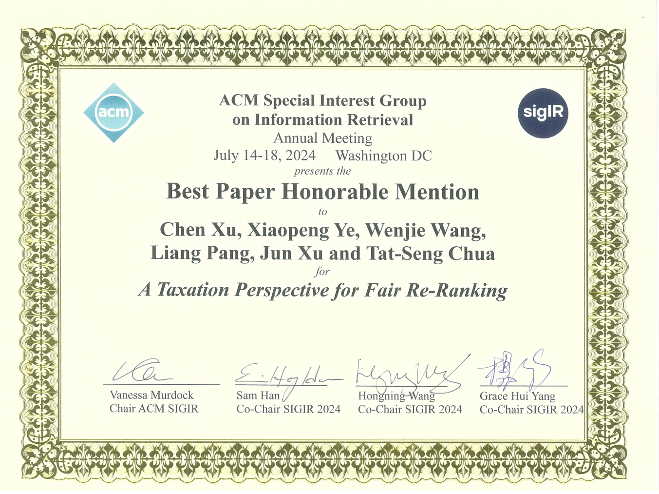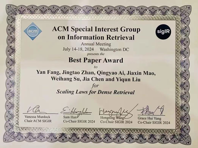 7月17日,信息检索领域国际学术会议SIGIR 2024正式公布了论文获奖名单,av直播 av直播 师生参与的4篇论文获奖。徐君教授团队论文“A Taxation Perspective for Fair Re-ranking”获得了长文最佳论文提名奖(Best Paper Honorable Mention Award), 毛佳昕副教授参与的长文“Scaling Laws for Dense Retrieval”被评为最佳论文奖(Best Paper Award)。徐君教授作为通讯作者的短文“ReCODE: Modeling Repeat Consumption with Neural ODE”,毛佳昕副教授作为通讯作者的演示论文“CoSearchAgent: A Lightweight Collaborative Search Agent with Large Language Models”获得了最佳短文提名(Best Short Paper Nominees)。