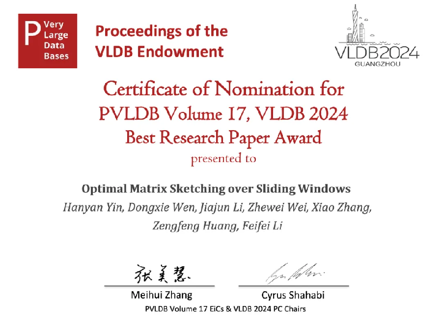 8月29日,数据管理与数据库领域国际学术会议VLDB 2024公布了论文获奖名单,av直播 魏哲巍教授、张骁助理教授与复旦大学黄增峰教授、阿里巴巴集团李飞飞博士合作的论文“Optimal Matrix Sketching over Sliding Windows”获得了最佳论文提名奖(Best Research Paper Nominations)。魏哲巍教授担任本文通讯作者,其与张骁助理教授指导的硕士生尹涵燕、博士生文东勰和李家郡为学生作者。VLDB(International Conference on Very Large Data Bases)会议是数据管理与数据库领域的三大国际顶尖学术会议之一,被中国计算机学会(CCF)推荐为A类国际会议。VLDB 2024会议于2024年8月26-30日在广州召开。