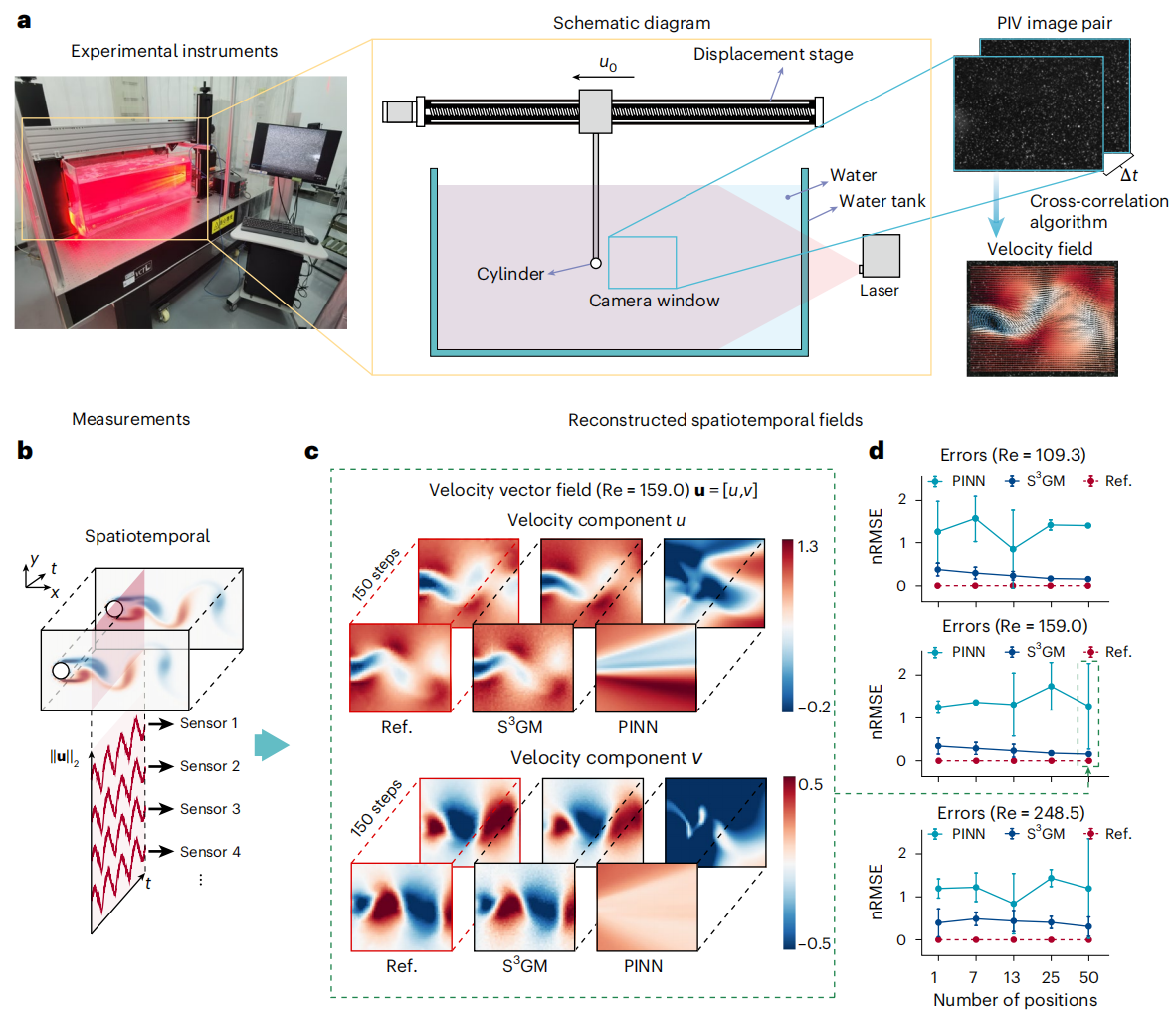 图4利用实验室测量的稀疏数据重构完整流场。子图a为实验装置图、子图b表示测量数据仅从流场单一截面处获取,而子图c和d展示了 S3GM 重构的结果