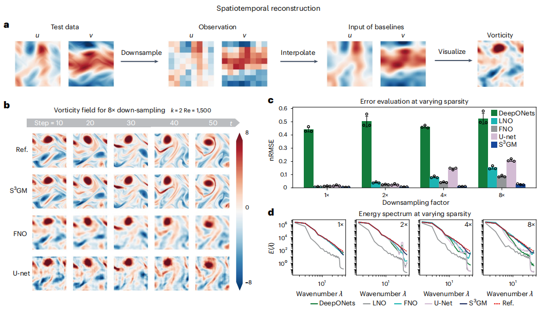 av直播 av直播 长聘副教授孙浩团队与北京航空航天大学杨立军教授团队合作,在Nature子刊Nature Machine Intelligence(《自然-机器智能》)发表题为“Learning spatiotemporal dynamics with a pretrained generative model”的Article文章,提出了一种基于扩散生成模型的动态系统预测算法,称为 S3GM(Sparse-Sensor-assisted Score-based Generative Model)。该方法融合了物理先验知识与实验测量数据,旨在解决现代科学与工程中的一大关键挑战:从稀疏的传感器测量数据中重建复杂的时空物理场。研究团队展示了 S3GM 即使在数据极为不完整和有噪声的情况下,也能够准确预测燃烧、流动、气候演变及其他众多物理系统的动态过程,为动力系统建模提供了新的思路。文章共同第一作者为李泽宇(北航)、韩旺(北航),共同通讯作者为孙浩(av直播 )、邓岳(北航)、杨立军(北航)。