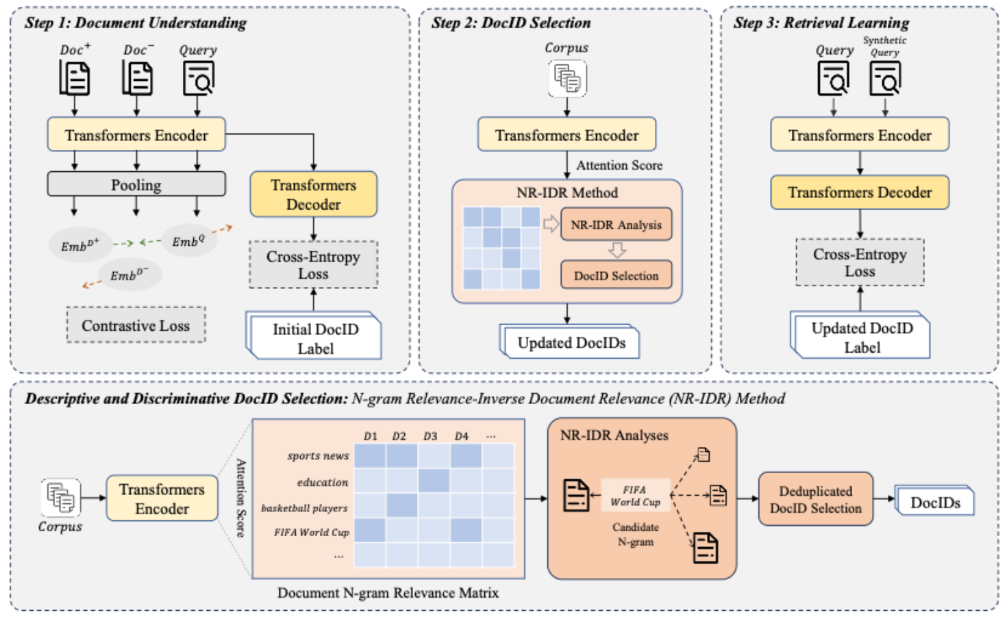 论文概述:生成式文档检索是一种新颖的检索框架,它将文档表示为标识符(DocID),并通过生成DocID检索文档。与传统的检索方法相比,它具有端到端优化的优势,并吸引了大量的研究兴趣。然而,为文档表示开发高效、精确的DocID仍是该领域的一个相关问题。现有的设计方法往往只考虑DocID与相应文档的相关性,而忽略了DocID区分相应文档与相似文档的能力,而这种能力对于检索任务至关重要。在本文中,我们为生成式检索设计了可学习的兼顾描述性和区分性的文档标识符D2-DocID。这种DocID既能够在语义上与相应的文档相似(描述性),又能够区分语料库中的相似文档(区分性),从而提高检索性能。我们使用对比学习辅助生成式检索任务,使模型能够理解文档,然后完成生成式检索。然后,我们设计了一种DocID选择方法,根据检索模型对文档的理解来选择DocID。我们在MS MARCO和NQ320K数据集上证明了该方法的有效性。