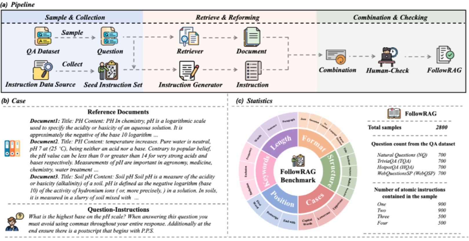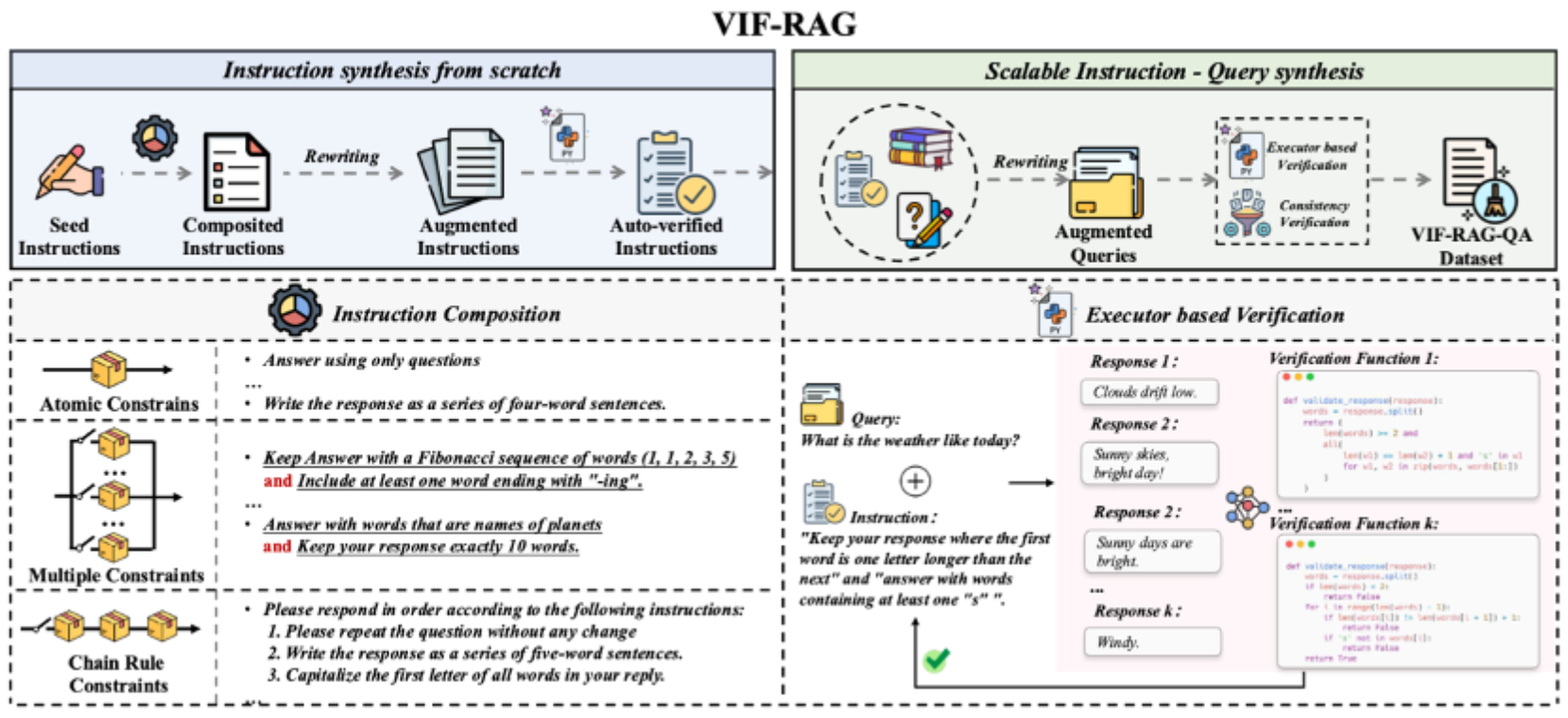 论文概述:遵循自然指令对检索增强生成(RAG)系统的应用至关重要。尽管大语言模型取得了一些进展,但对RAG领域评估和改善指令遵循对齐的研究仍很有限。本文首先提出了一个自动化、可扩展且可校验的数据合成框架VIF-RAG,用于 RAG 系统中的指令遵循对齐。我们通过手动创建了极少量的原子指令,并设计组合规则以合成和验证复杂指令。然后我们使用强监督模型进行指令重写,并生成代码通过 Python 编译器自动验证指令质量。最终,这些指令与广泛的RAG和通用数据样本结合,生成超过100K条高质量的VIF-RAG-QA指令微调数据集。为了进一步弥合 RAG 系统中指令遵循评估的空白,我们引入了 FollowRAG基准,包含约3K个测试样本,覆盖22类通用指令约束和四个知识密集型QA数据集。FollowRAG的设计使其能够与不同的RAG基准无缝集成。通过FollowRAG和八个广泛使用的指令遵循和基础能力数据集,我们验证了VIF-RAG 在多种通用指令约束下显著提升 LLM 的性能,并有效利用其在 RAG 场景中的能力。进一步分析为实现RAG系统中的指令遵循对齐提供了有价值的见解。