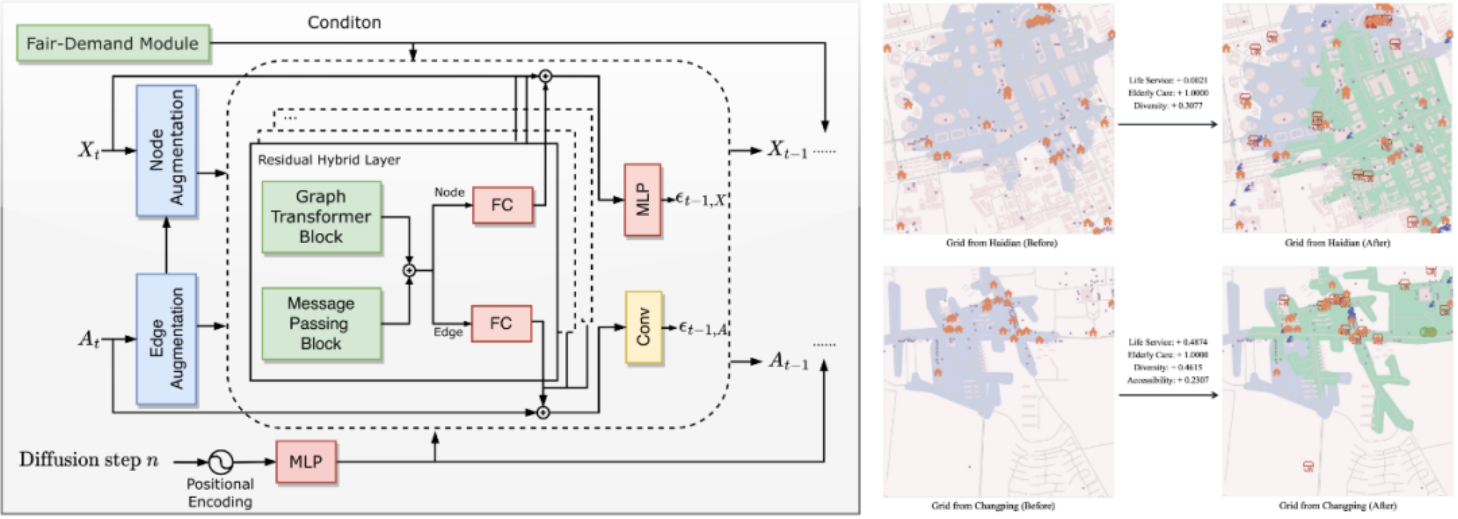 论文概述:随着全球人口迅速老龄化,将老年化需求纳入城市规划对老年友好城市建设和可持续发展的环境至关重要。然而,目前城市规划未能充分实现老年友好型布局,导致老年服务分布不均且不足,这突显了老年友好型城市更新策略的紧迫性。为应对这一挑战,我们提出了一种基于条件扩散生成的公平驱动老龄友好型社区规划框架(FAP-CD),该框架利用条件图去噪扩散概率模型学习老年化设施及其在细粒度区域空间关系的条件联合概率分布。在训练阶段,我们引入了一个需求公平预训练模块,该模块利用注意力机制和极大-极小优化,将社区需求特征与城市特征整合,确保服务在不同地区之间的分布均衡。此外,我们使用离散图结构表示区域道路网络中的潜在15分钟步行可达性,作为加速模型采样的指导条件。实验表明,所提出的框架相较于各种竞争性基准模型,在平衡老年友好需求与区域公平性方面表现卓越。