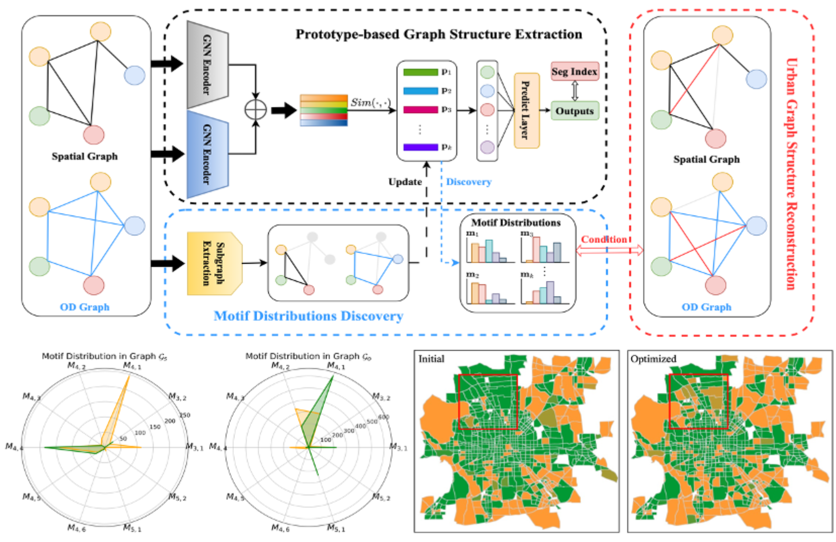 论文概述:城市中的社会隔离问题正变得愈加多样且严重,包括种族隔离、居住隔离和收入隔离等。随着城市空间和社会关系的日益复杂,大都市地区的居民正面临着不同程度的社会隔离问题。如果这一问题得不到及时解决,很可能导致城市犯罪率上升、社会紧张加剧等一系列严重的社会问题。准确量化并分析城市空间的结构以及居民互动模式,已成为解决这些隔离问题的关键方法。过往研究大多关注城市隔离的浅层统计指标,缺乏从城市结构和流动性角度进行的全面分析,无法充分揭示当前社会隔离现象的复杂性。为解决这一问题,我们提出了一个名为“Motif增强的图原型学习”(MotifGPL)的框架。该框架包括三个核心模块:基于原型的图结构提取模块、motif分布发现模块和城市图结构重构模块。具体而言,我们通过图原型学习,结合POI、街景图像和流动指数等重要的城市属性数据,从城市空间图和OD图中提取关键原型。同时为提高模型的可解释性,我们在motif分布发现模块中,将每个原型与motif模式进行匹配,这些模式代表了反映局部规律的简单图结构。最后,我们利用motif分布结果来指导城市空间图的重构。该模型深入分析了城市空间结构和居民流动模式,帮助我们识别和解析影响城市社会隔离的关键模式,并为构建低隔离程度的城市结构提供有力指导。大量实验结果表明,该框架能够有效揭示影响城市社会隔离的关键模式,并为缓解这一现象提供有力支持。