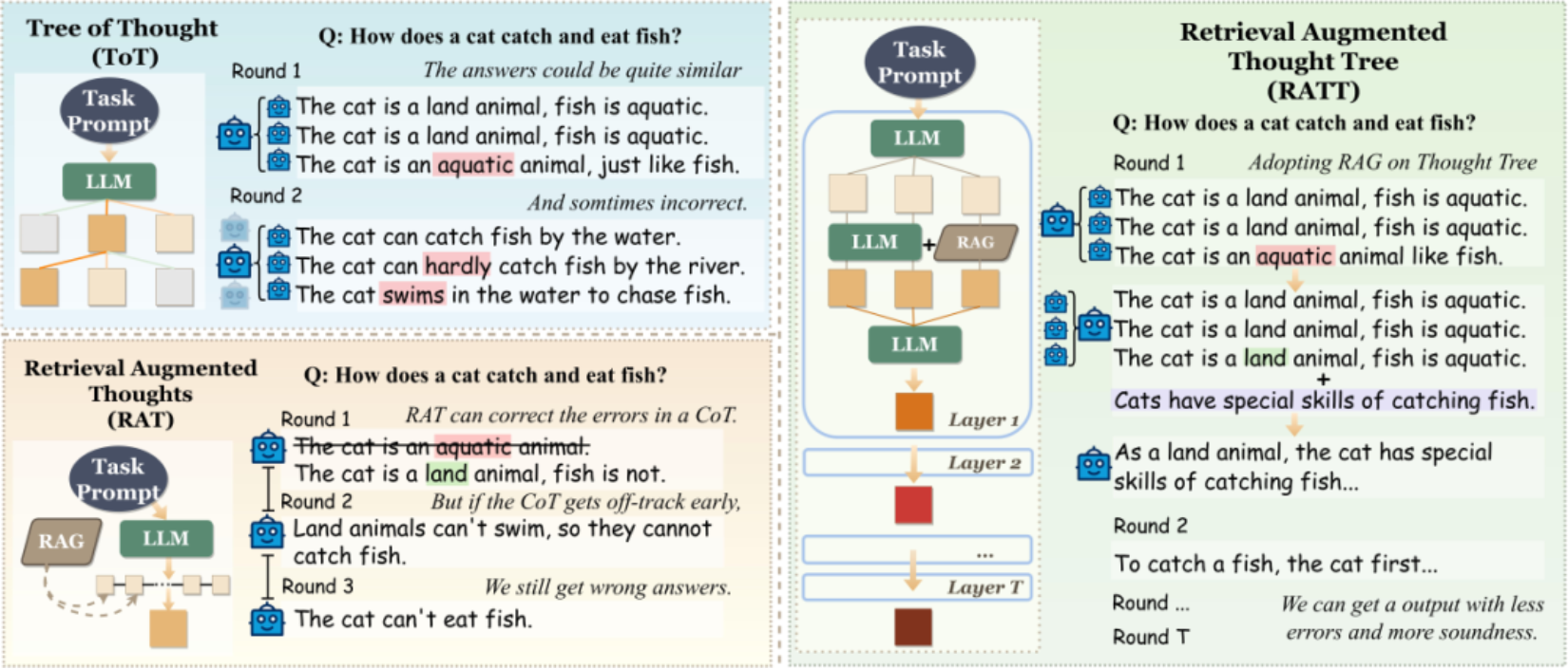 论文概述:大语言模型(LLMs)从思维结构中获得了强大的推理和决策能力。然而,现有的方法,例如“思维树”(Tree of Thought)和“检索增强思维”(Retrieval Augmented Thoughts),在处理复杂任务时常常表现不佳。这主要是由于局部事实知识检索不足和全局策略选择不充分的限制。这些问题使得这些方法难以在事实准确性和全面的逻辑优化之间有效平衡。为了解决这些问题,我们提出了一种新的思维结构——检索增强思维树(Retrieval Augmented Thought Tree, RATT),该结构在思维过程的每一步同时考虑整体逻辑合理性和事实正确性。具体来说,在思维树的每个分支节点上,RATT通过规划和前瞻性思考来探索和评估多个潜在的推理步骤,并结合检索增强生成(RAG)的事实核查能力与大型语言模型的整体策略评估能力。通过这一事实知识与策略可行性相结合的方法,RATT能够调整并整合思维树的结构,在搜索空间内寻找最有前景的分支。这种思维结构显著提升了模型在逻辑推理中的连贯性和决策中的效率,从而拓展了大语言模型基于思维结构生成可靠推理和决策的能力上限。在不同类型任务上的广泛实验表明,RATT结构在事实正确性和逻辑连贯性方面显著优于现有方法。