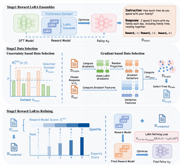 论文概述:基于人类反馈的强化学习已成为训练大型语言模型以符合人类偏好的标准且有效的方法。在此框架下,通过学习奖励模型来近似人类偏好,并以此指导策略优化,因此开发准确的奖励模型至关重要。然而,在缺乏“真实”奖励函数的情况下,当奖励模型作为人类偏好的不完美代理时,会出现诸多挑战。尤其是策略优化过程会不断改变人类偏好训练数据集的分布,而固定奖励模型会因分布外问题而受到影响,尤其是对于在线策略、方法。虽然收集新的偏好数据可以缓解这一问题,但成本高昂且优化难度较大。因此,重新利用策略交互样本成为进一步优化奖励模型的可能途径。为应对这些挑战,本文提出了一种新的方法——不确定性梯度数据增强(Uncertainty-Gradient based Data Augmentation,UGDA),通过利用策略样本维持在分布性能,从而增强奖励建模。具体而言,UGDA基于奖励集成的不确定性和策略优化的梯度影响来选择交互样本。在对选定样本进行奖励重新标记后,利用监督学习来优化奖励集成,进而获得重新训练的策略。大量实验表明,借助UGDA在无需成本高昂的人类偏好数据收集的情况下选择少量样本,能够提升策略的能力,并超越现有最先进的方法。