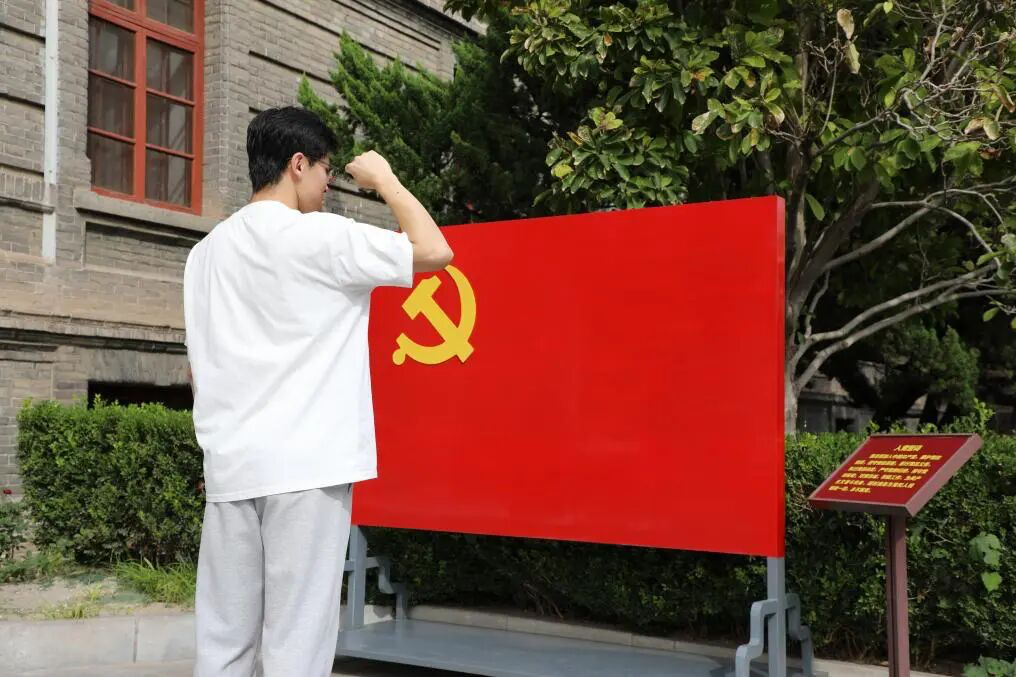 活动伊始,纪念馆楼前气氛庄重。新转正党员张文波身着整洁服装肃立,目光坚定地望向鲜红的党旗,庄严地举起右手,握紧拳头,以洪亮的声音庄严宣读入党誓词。每一句誓言都铿锵有力,在红楼古朴的建筑旁久久回荡,既传递出他对党的无限忠诚,也彰显了为共产主义事业奋斗终身的坚定决心。