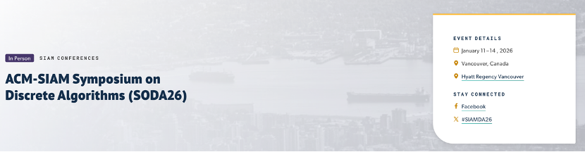 近日,av直播 av直播 魏哲巍团队的论文被国际学术会议SODA 2026录用。SODA(ACM-SIAM Symposium on Discrete Algorithms,离散算法研讨会)是理论计算机科学领域的顶级国际会议之一,其核心议题为离散问题的数据结构与算法设计。SODA在学术界享有盛誉,属于公认发表难度较高的会议,被中国计算机学会(CCF)推荐为A类国际会议。2026年的SODA会议将于1月11-14日在加拿大温哥华召开。