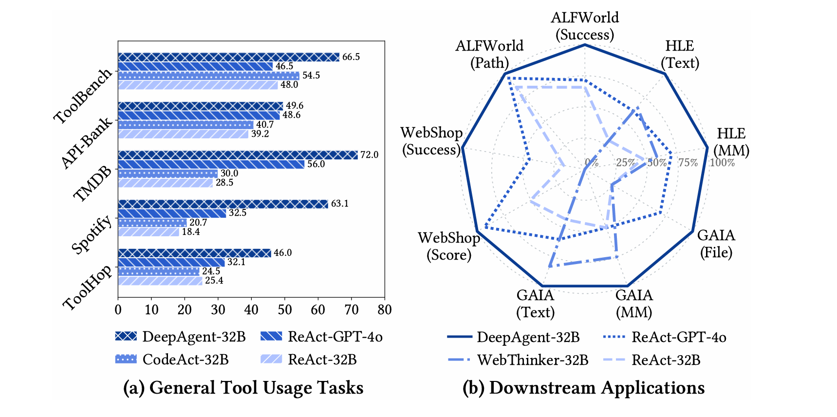 它颠覆了传统智能体的预定义工作流,将思考、工具发现与执行全部融合在一个统自主的推理进程中。通过引入自主记忆折叠机制和端到端强化学习训练方法ToolPO,DeepAgent在8个基准测试中持续超越基线方法,在标注工具和开放集工具检索场景下均表现出色。这项工作为构建更通用、更强大的真实世界智能体迈出了重要一步。