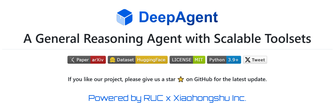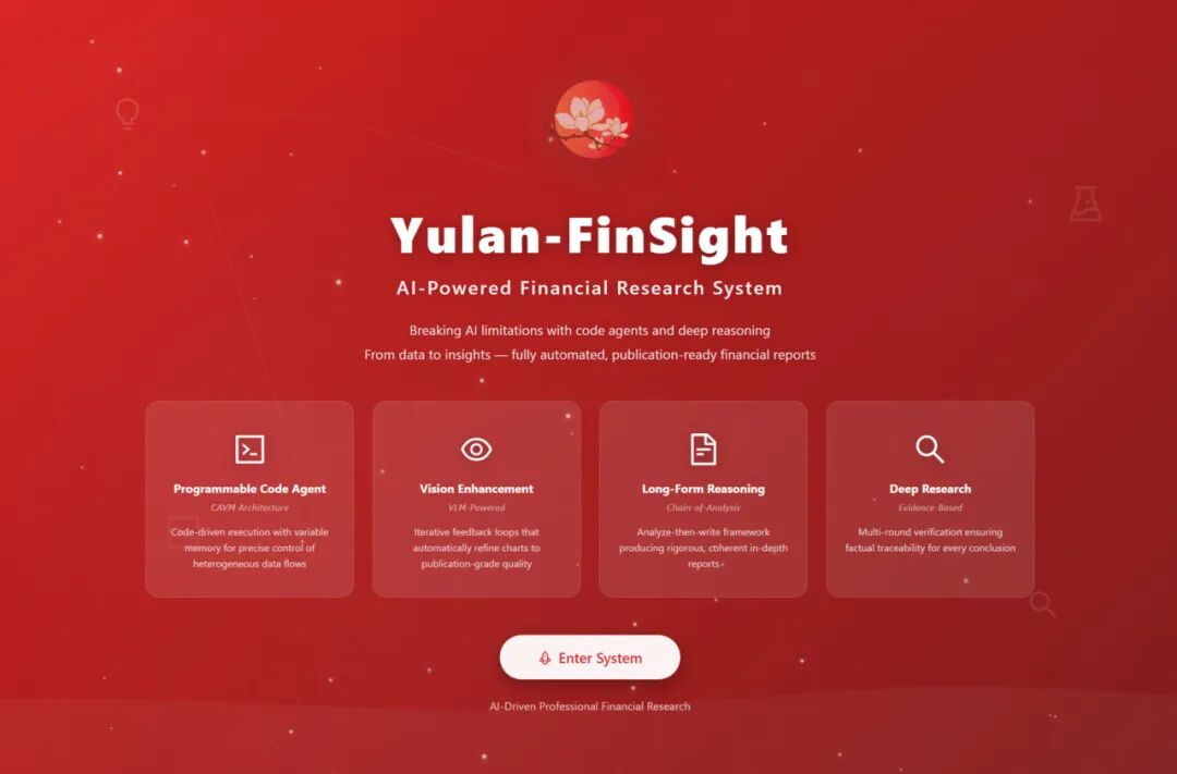 在智能体系统方向,发布支持自动化场景构建的大规模社会模拟平台 “玉兰-万象(YuLan-OneSim)”,用户可通过自然语言逐步描述场景,系统自动生成并执行模拟代码,显著降低社会模拟的开发门槛;推出面向真实投研流程的多模态金融研报生成系统 “玉兰·融观(Yulan-FinSight)”,实现从数据搜集、分析到图文报告生成的端到端自动化;同时提出通用推理智能体 DeepAgent,将“思考—工具发现—行动执行”统一到连贯推理过程中,并通过记忆折叠等机制支撑长时序、多工具调用任务。
