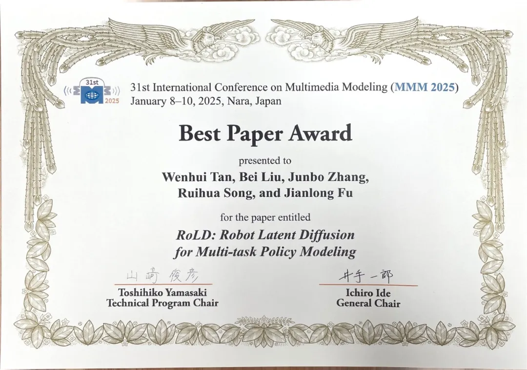 在大模型方向,创新性提出离散扩散语言模型 LLaDA,通过“前向掩码—反向生成”的扩散过程,由Transformer逐步预测并还原被掩码的token,从而突破传统自回归范式的单向生成路径;在此基础上进一步提出LLaDA-MoE,将扩散语言建模与稀疏Mixture-of-Experts架构结合,在保持模型容量的同时显著降低推理激活参数与计算开销。同时,面向具身智能与“语言/行动”基础模型融合,提出RoLD(Robot Latent Diffusion)多任务策略建模方法,并获国际多媒体建模会议 MMM 2025 最佳论文奖。