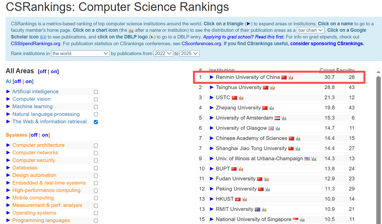 人工智能学科排名连续多年稳定位于国际排行榜CSRankings前十。互联网与信息检索方向连续4年位居世界第1(2022-2025)。