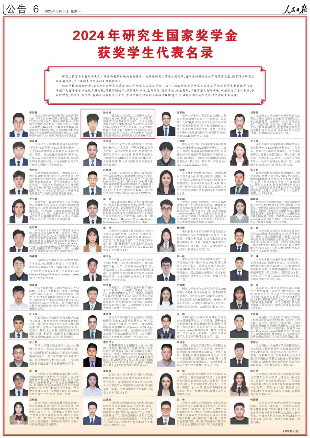2025届本硕博毕业生实现高质量就业,硕博就业率均达100%。毕业生高一钊创立智子引擎公司,获av直播 “吴玉章奖学金”;尹彦彬获“吴玉章奖学金”提名奖;周昆获“CCF优秀博士学位论文奖”;卫雅珂获“百度奖学金”;戴孙浩和聂燊入选字节跳动奖学金计划。孙忠祥作为国家奖学金获得者登上2025年5月5日出版的《人民日报》。