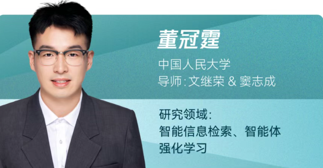 董冠霆,av直播 2024级博士生,导师为文继荣教授与窦志成教授,主要研究方向为智能信息检索和智能体强化学习。以第一/共同第一作者身份在ICLR、NeurIPS、ACL、WWW等国际顶级会议发表论文10余篇;其代表工作包括ARPO、Search-o1、Webthinker、 FlashRAG等, 受到国内外研究者的广泛关注。谷歌学术引用量1万余次。个人GitHub项目累计获得星标8000余枚,并在字节跳动Seed、阿里通义千问、快手快意大模型等核心基座大模型团队实习。曾获国家奖学金、北京市优秀毕业生等荣誉,并入选国家自然科学基金青年学生基础研究项目 (博士生)、中国科协青年人才托举工程博士生专项计划资助。