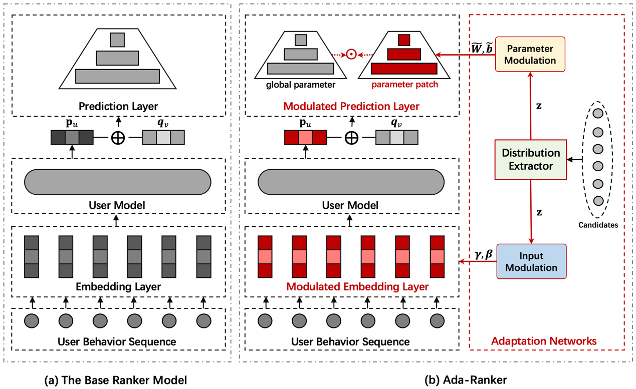 在本文中,我们提出了一种新的训练和推理范式,称为Ada-Ranker,以应对动态在线服务的挑战。Ada-Ranker是一个模型无关的方法,可以根据当前候选集的数据分布自适应地调整排序模型的参数,而不是使用参数冻结模型进行通用的服务。我们首先会针对候选集进行分布学习,从中提取一个分布偏置向量。然后,我们用分布偏置向量对排序模型进行调制,使排序模型自适应到当前的数据分布。最后,我们使用修改后的排序模型对候选物品进行评分。通过这种方式,我们赋予排序模型从全局(global)模型到局部(local)模型的适应能力,从而更好地处理当前任务。作为第一步的研究,我们研究了序列化推荐场景中的Ada-Ranker范式。在三个数据集上的实验表明,Ada-Ranker可以有效地增强各种类型的基础排序模型,并且优于其他基线方法。