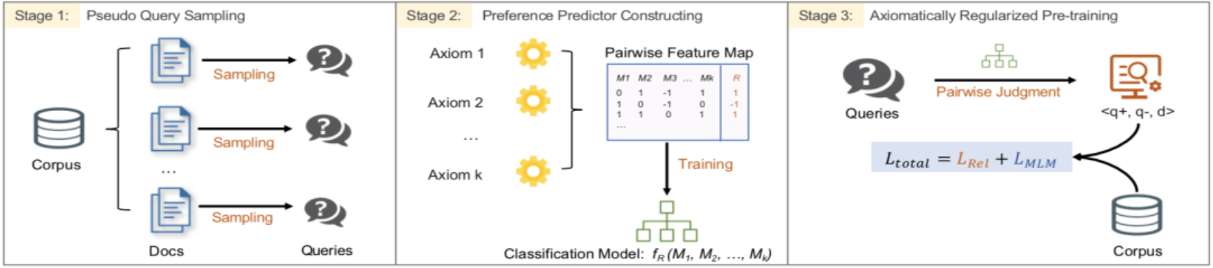 论文概述:近年来,预训练语言模型被广泛应用于信息检索和文档排序任务上。然而,由于预训练语言模型结构和包含预训练和微调两个阶段的训练过程较为复杂,我们很难了解模型在预训练过程中学习到了哪些对于文档排序有用的知识。因此,基于预训练语言模型在该任务中是一个缺乏可解释性的黑盒。为了解决上述问题,提升排序模型的鲁棒性和可解释性,我们尝试将IR公理引入到模型的预训练过程中。通过对已有工作中提出的IR公理进行归纳、总结和修改,我们选取了适合进行预训练的IR公理,并提出了一个名为ARES的预训练框架。在多个公开数据集上的实验结果表明ARES框架在训练检索模型方面的有效性。相较于现有方法,ARES框架在低资源场景(Few-shot和Zero-shot)下能取得更为明显的性能提升。在zero-shot场景下进行的可视化分析进一步显式了ARES模型能够有效的学习通过IR公理引入的排序规则。