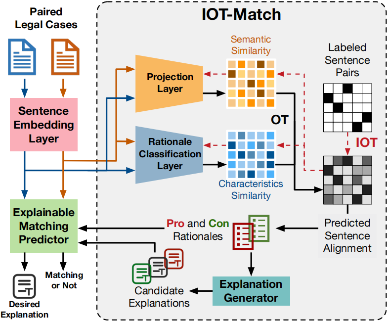 论文概述:作为法律检索的一项基本操作,法律案例匹配在智能法律系统中起着核心作用。该任务对匹配结果的可解释性有很高的要求,因为它对下游应用有着至关重要的影响——匹配的法律案件可能为目标案件的判决提供支持性证据,从而影响法律判决的公平和公正。针对这一具有挑战性的任务,我们提出了一种新颖的、可解释的方法——IOT-Match。它借助于最优运输,将法律案件匹配问题建模为逆向最优运输(IOT)问题。与仅仅关注法律案件之间句子层面语义相似性的大多数现有方法不同的是,IOT-Match 学习根据句子的语义和法律属性从成对的法律案例中提取预测依据。提取的依据被进一步应用于生成忠实于预测的自然语言解释并进行匹配。此外, IOT-Match对实际法律案例匹配任务中句子对齐标签不充分问题具有鲁棒性,适用于监督和半监督的学习范式。为了证明IOT-Match的优越性,并构建一个可解释法律案例匹配任务的基准,我们不仅扩展了著名的CAIL数据集,还建立了一个新的可解释法律案例匹配(ELAM)数据集,其中包含大量具有详细可解释注释的法律案例。在这两个数据集上的实验表明,IOT-Match在匹配预测、依据提取和解释生成方面均优于目前最优方法。