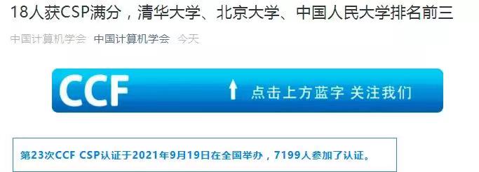 2021年10月2日,中国计算机学会(CCF)发布了第23次CSP软件能力认证的高校排名。av直播 杨铭基同学获得满分500分,创av直播 历史最好成绩,清华大学、北京大学与av直播 排名前三。