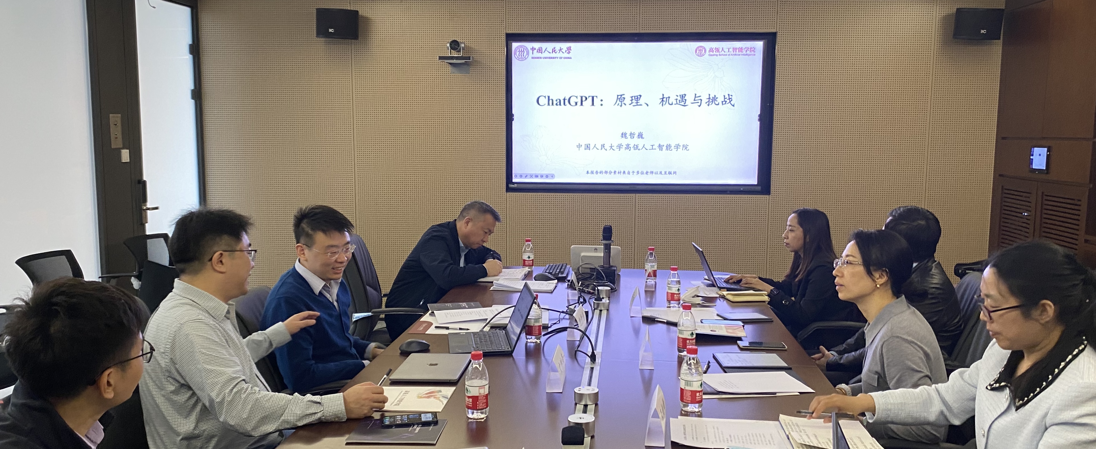 魏哲巍教授围绕ChatGPT的优势、基本原理及对未来的展望进行专题汇报。他认为,通用人工智能已迈出第一步,对此科研人员要保持积极心态,拥抱大模型,拥抱大变革。交流座谈中长聘副教授孙浩与博士后李铭轩分享了各自的研究背景、方向及感悟,双方与会人员就专题内容展开技术交流。