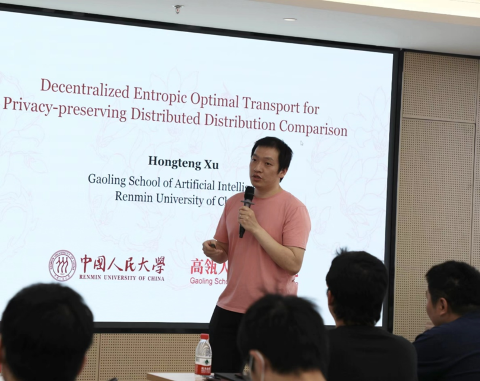 av直播 av直播 准聘副教授许洪腾的报告围绕如何在分布式系统中度量不同分布的距离展开,他首先指出在分布式系统中由于隐私保护的原因不同代理不能共享原始数据,因此产生了如何衡量数据分布距离的问题,为此,许洪腾老师介绍了基于最优传输理论提出的去中心化的熵最优传输(EOT)方法,该方法为分布式系统中的隐私保护和通信效率提供了理论保证。