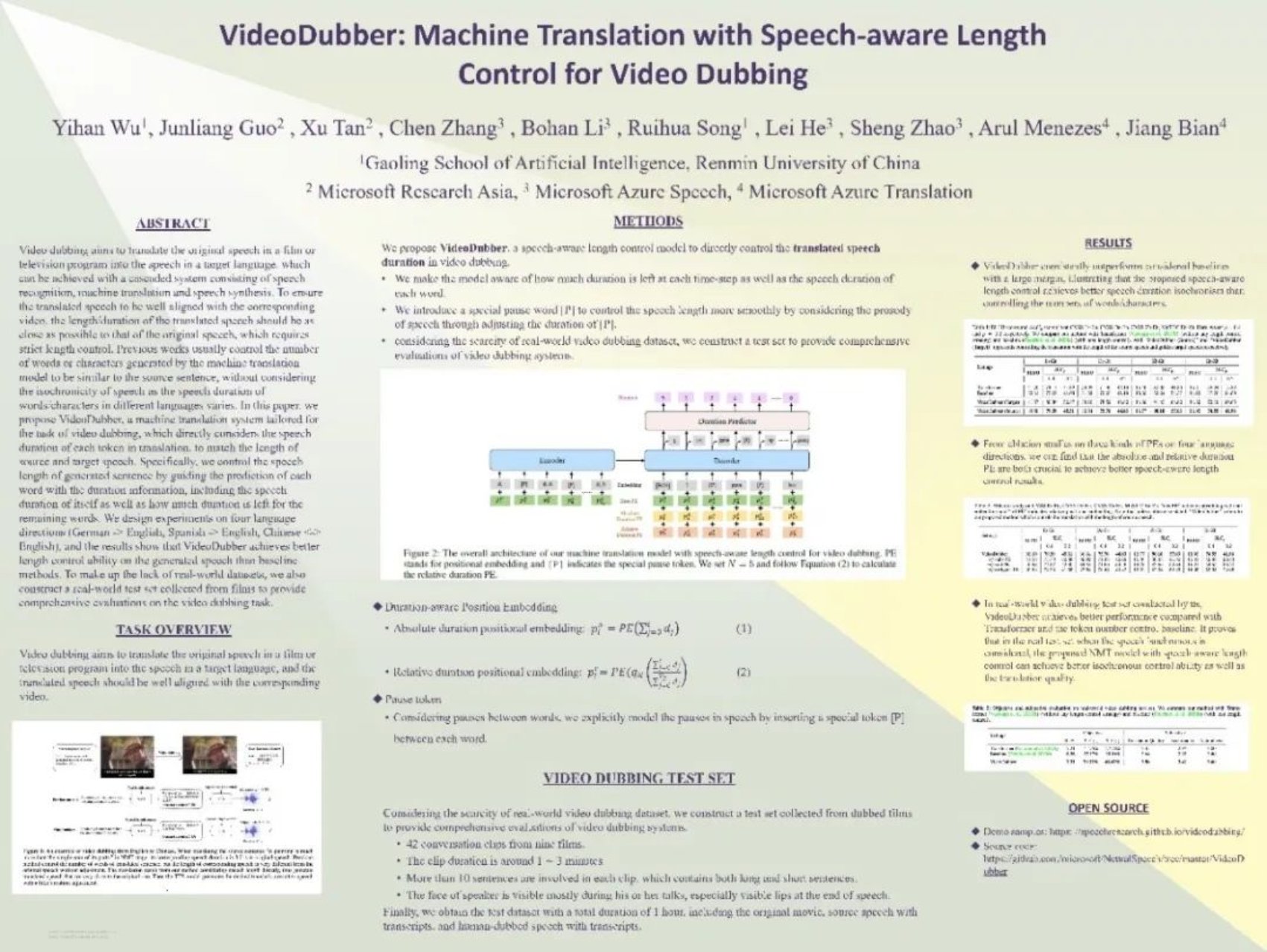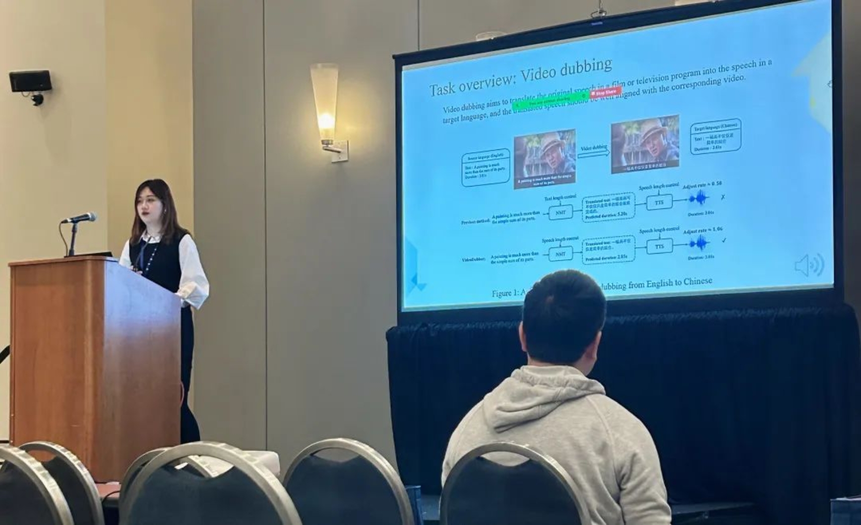 她关于AI创作的工作“VideoDubber: Machine Translation with Speech-Aware Length Control for Video Dubbing”被AAAI 2023 接收为口头报告(Oral Presentation),在主题为“Speech & Natural Language Processing”的环节中介绍并分享了她们的工作。这篇工作提出了一种针对视频配音任务的机器翻译系统,该系统直接考虑翻译过程中每个词的语音时长并显式控制,以匹配原始语音与翻译后语音的总时长。VideoDubber在四个语言方向(德语→英语、西班牙语→英语、汉语→英语,英语→汉语)上设计实验,结果表明该方法对生成的语音具有较好的长度控制能力,优于基线方法。