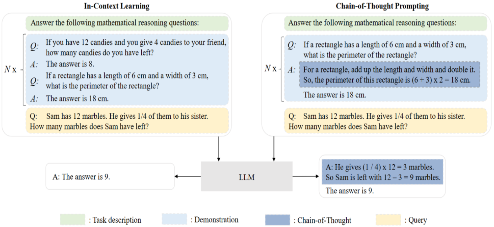 图5 两种使用技术上下文学习(ICL)和思维链提示(CoT)的对比