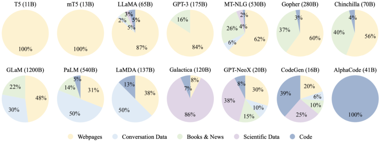 图2 现有大语言模型预训练数据中各种数据源的比例