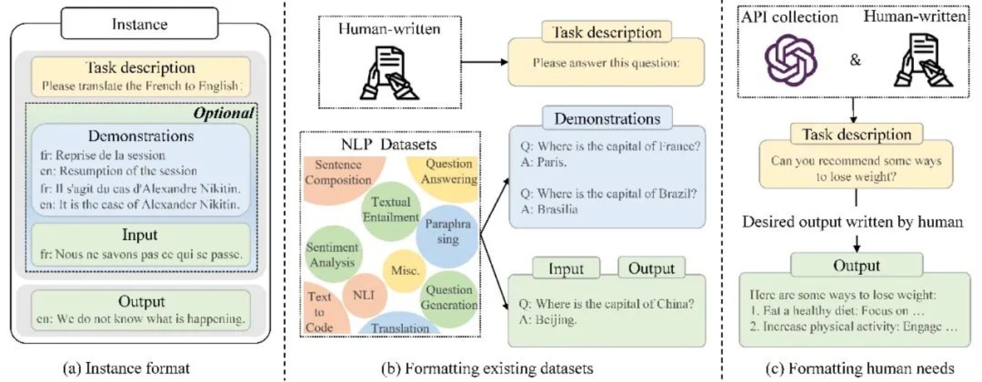 ●指令微调通过收集指令格式的实例(图3)来微调大模型,大大增强了模型遵循人类指令的能力,能够让模型更好地泛化到未知任务。我们展示了两种收集指令格式实例的方法,并讨论了任务数量、实例数量、实例设计等因素对指令微调效果的影响;同时,我们也总结了指令微调过程中常见的数据集合和训练细节,方便研究者训练自己的模型。