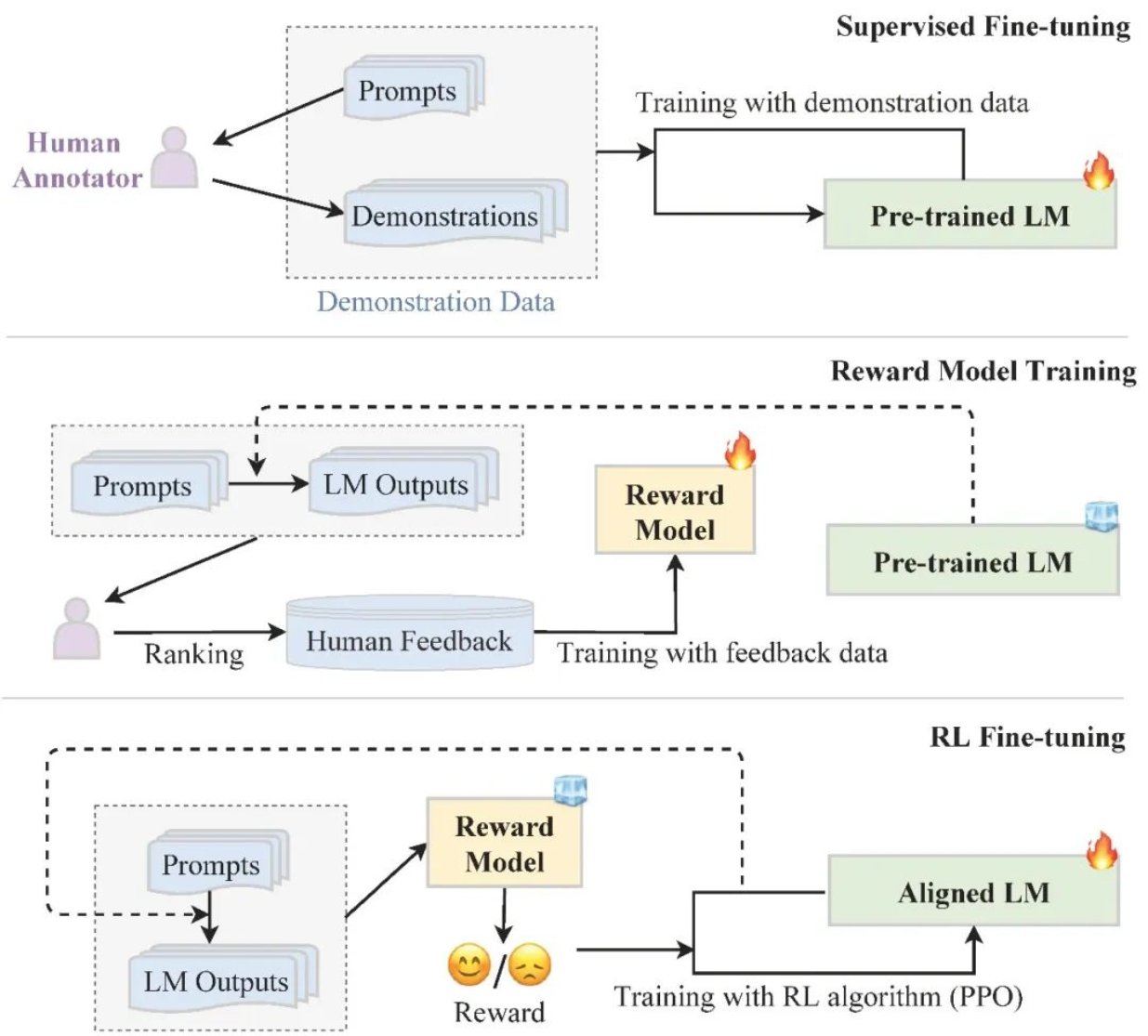 ●对齐微调通过收集人类反馈数据,利用强化学习进一步微调大模型,使模型与人类对齐,更加符合人类的偏好。我们首先讨论了三种常见的对齐标准:有用性、诚实性和无害性,接着展示了三种人类反馈收集方式,最后介绍了基于人类反馈的强化学习流程(图4)。