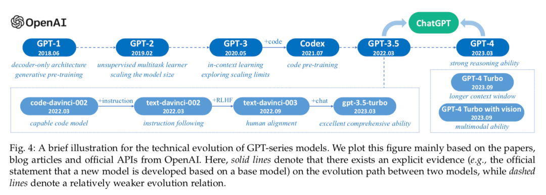 在Overview章节,我们新增了关于scaling law的深入讨论,主要是围绕predictable scaling和task-level predictability展开了相关介绍,并且介绍了scaling law与涌现能力间的一些讨论。同时,我们更新了GPT系列发展路径配图,加入了关于GPT-4v以及GPT-4 Turbo的文字介绍。