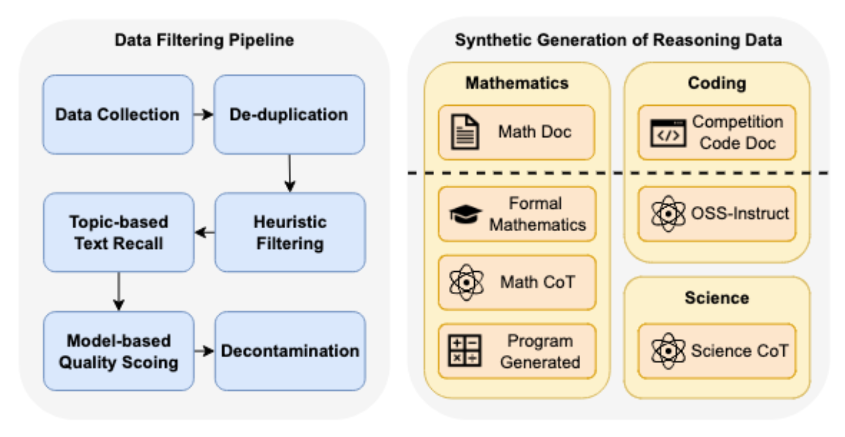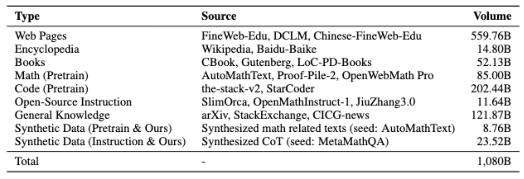 包括数学(合成文档、CoT推理、形式化数学等);代码(合成文档和CoT推理等)和科学。我们特别发现基于Lean的形式化数学和进阶推理数据(比如类o1具备反思的思维链)数据的有效性。