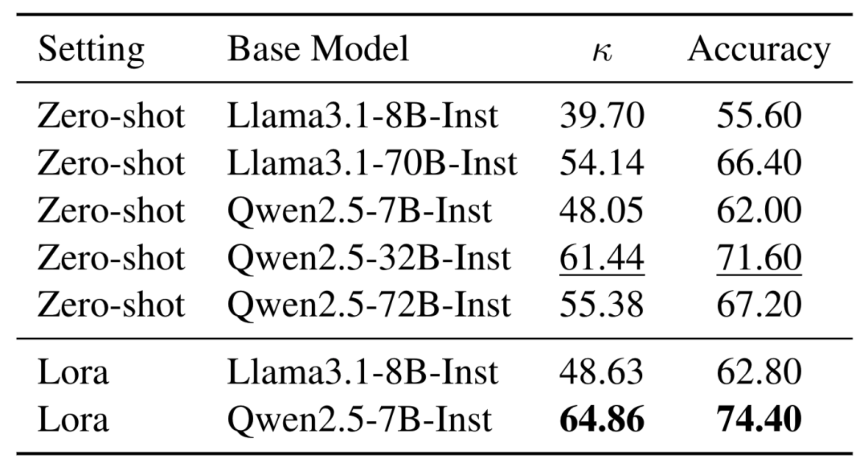 表3:基于模型的评估器实验结果。比较了不同设置(零样本和Lora微调)下Llama3.1和Qwen2.5不同模型规模在准确性和κ值方面的表现,确定了用于构建评估器的最佳模型。