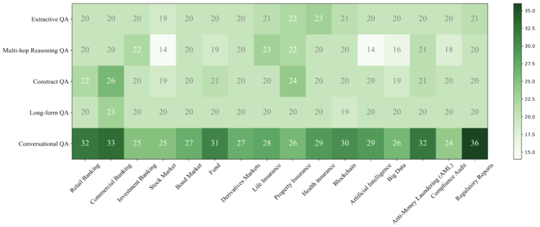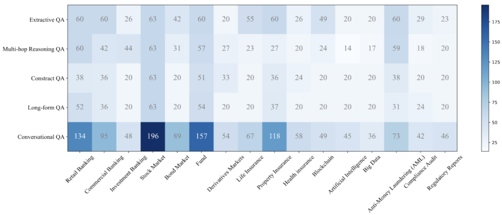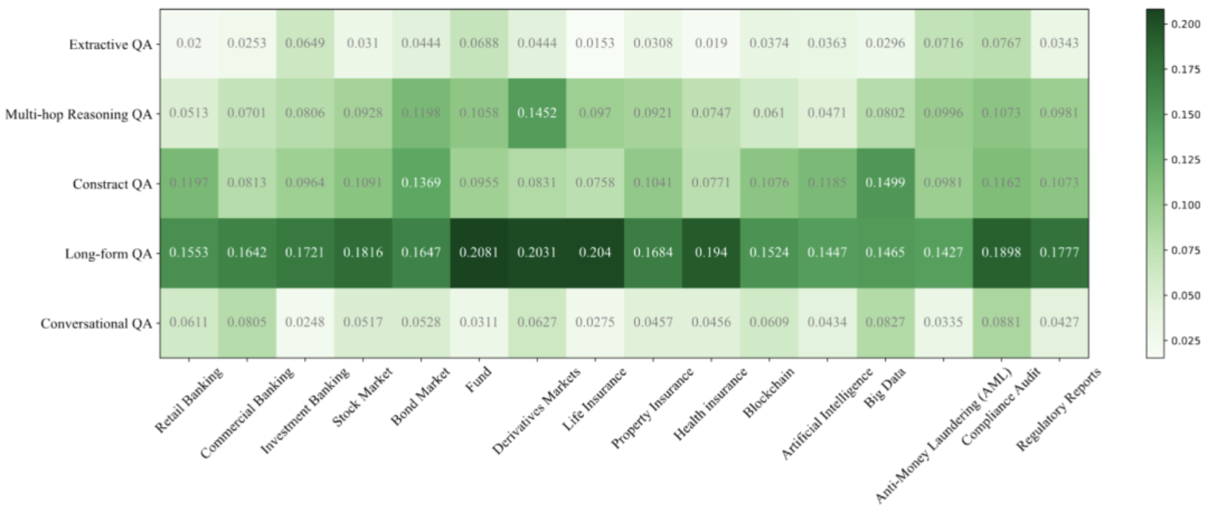 图2:用于构建基准的主题树。包含商业银行业务、股票市场、人寿保险、银行业、债券、财产保险、投资基金、金融衍生品市场、健康保险、监管与合规、反洗钱(AML)、金融科技、区块链、大数据人工智能、合规、监管报告等16个金融主题。