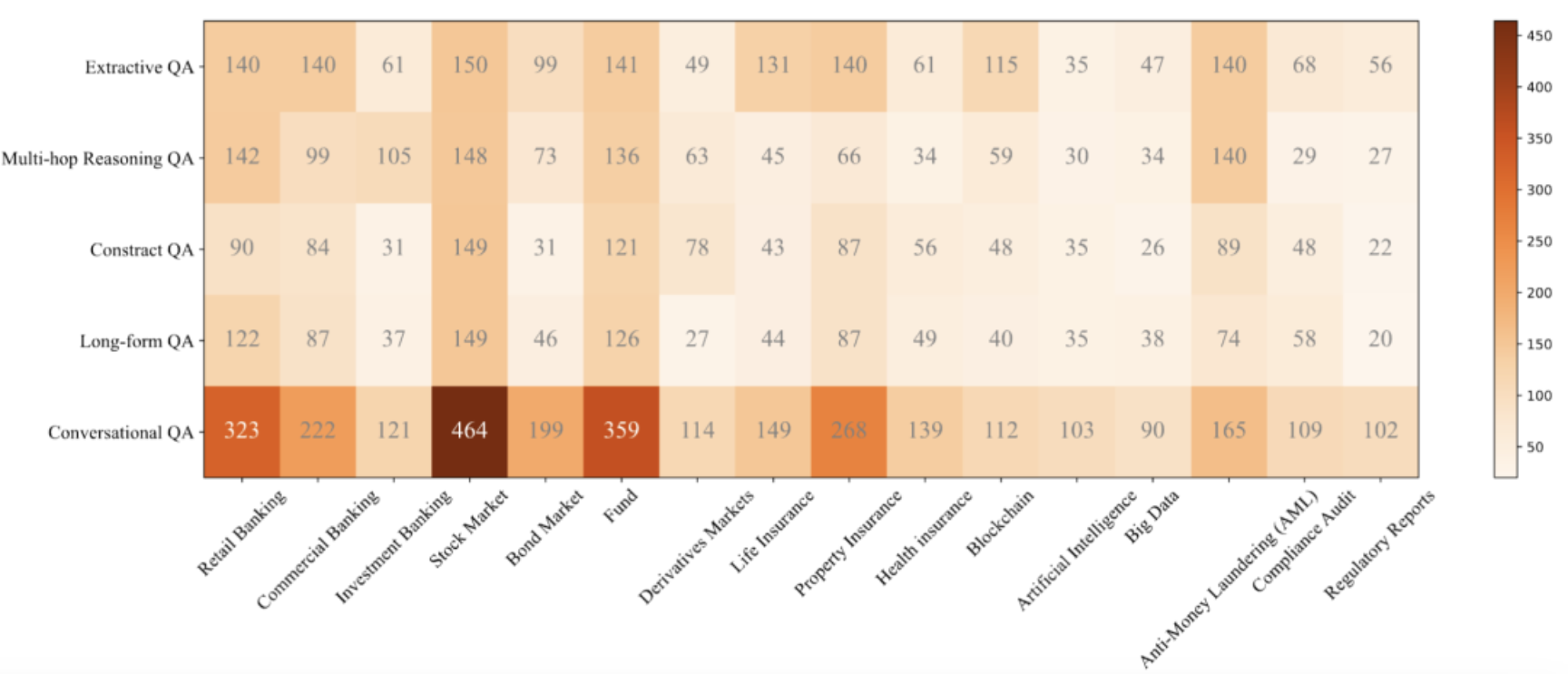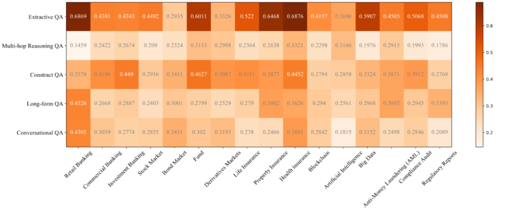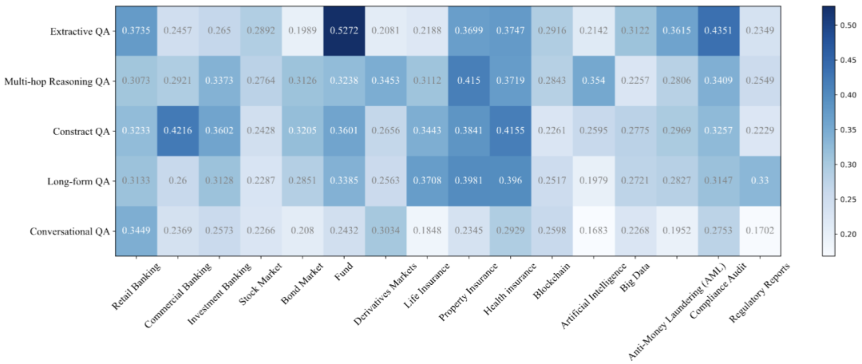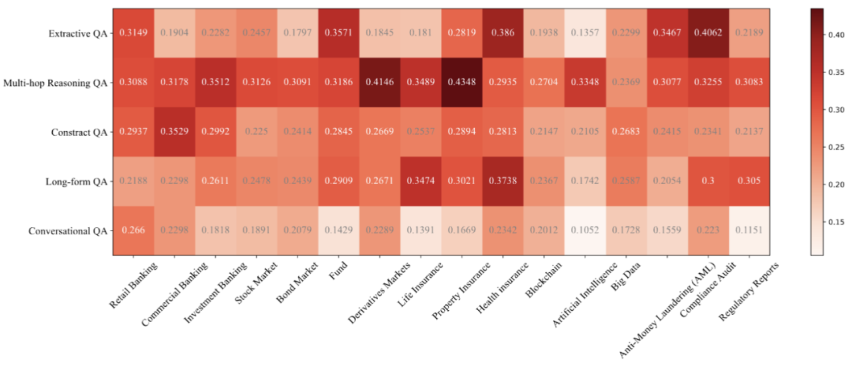 图2:用于构建基准的主题树。包含商业银行业务、股票市场、人寿保险、银行业、债券、财产保险、投资基金、金融衍生品市场、健康保险、监管与合规、反洗钱(AML)、金融科技、区块链、大数据人工智能、合规、监管报告等16个金融主题。