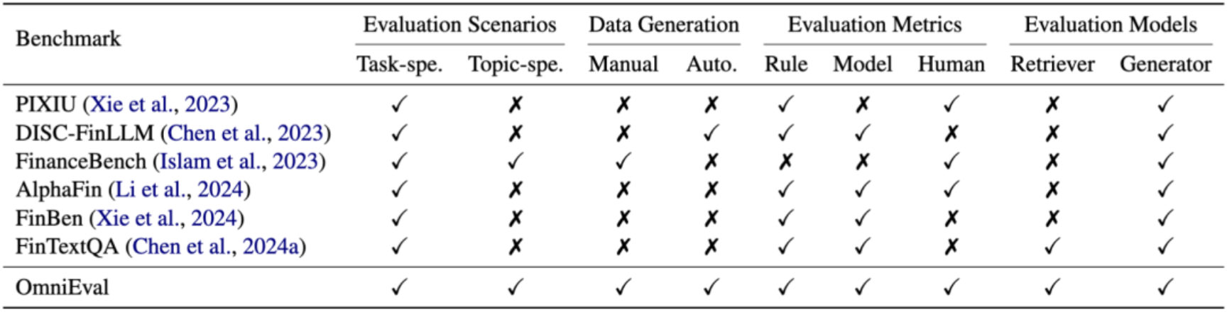表1:与现有金融基准的比较。对比了OmniEval基准与PIXIU、DISC - FinLLM、FinanceBench、AlphaFin、FinBen、FinTextQA等基准在评估场景、数据生成方式、评估指标、评估模型等方面的差异。