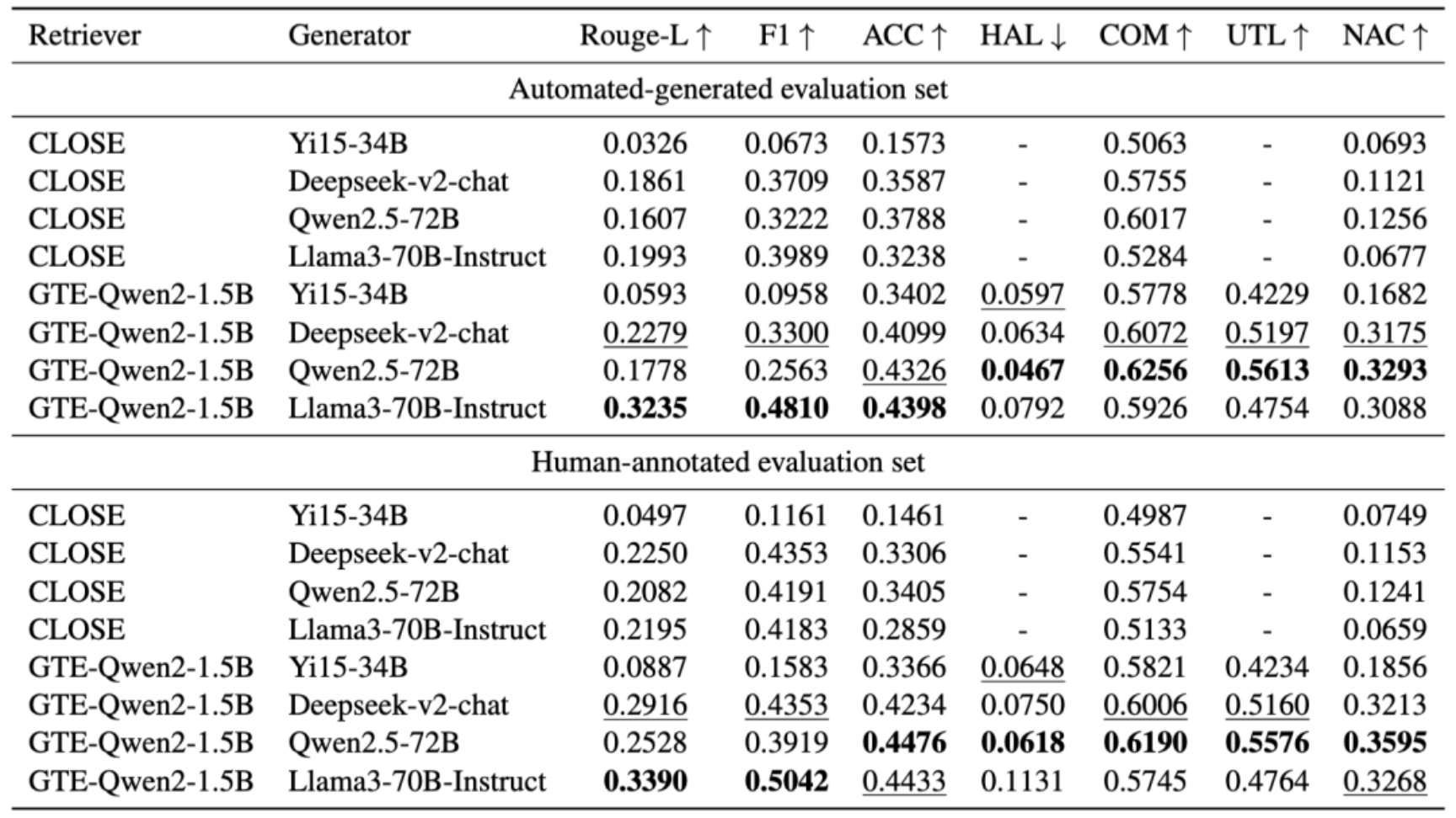 表5:RAG模型最终响应的整体评估结果。呈现了不同检索器与生成器组合(如CLOSE与不同生成器、不同检索器与Qwen2.5 - 72B等)在ROUGE - L、F1、ACC、HAL、COM、UTL、NAC等指标上的评估结果,全面反映RAG模型的性能。