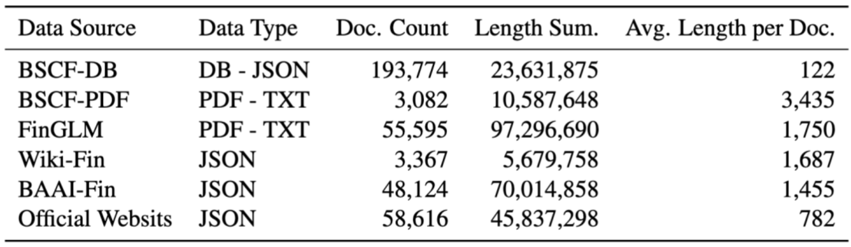 表2:不同数据源的统计信息。涵盖数据来源(如BSCF - DB、BSCF - PDF、FinGLM、Wiki - Fin、BAAI - Fin、官方网站等)、数据类型、文档数量、总长度、平均长度等信息,展示了构建知识语料库的数据基础。
