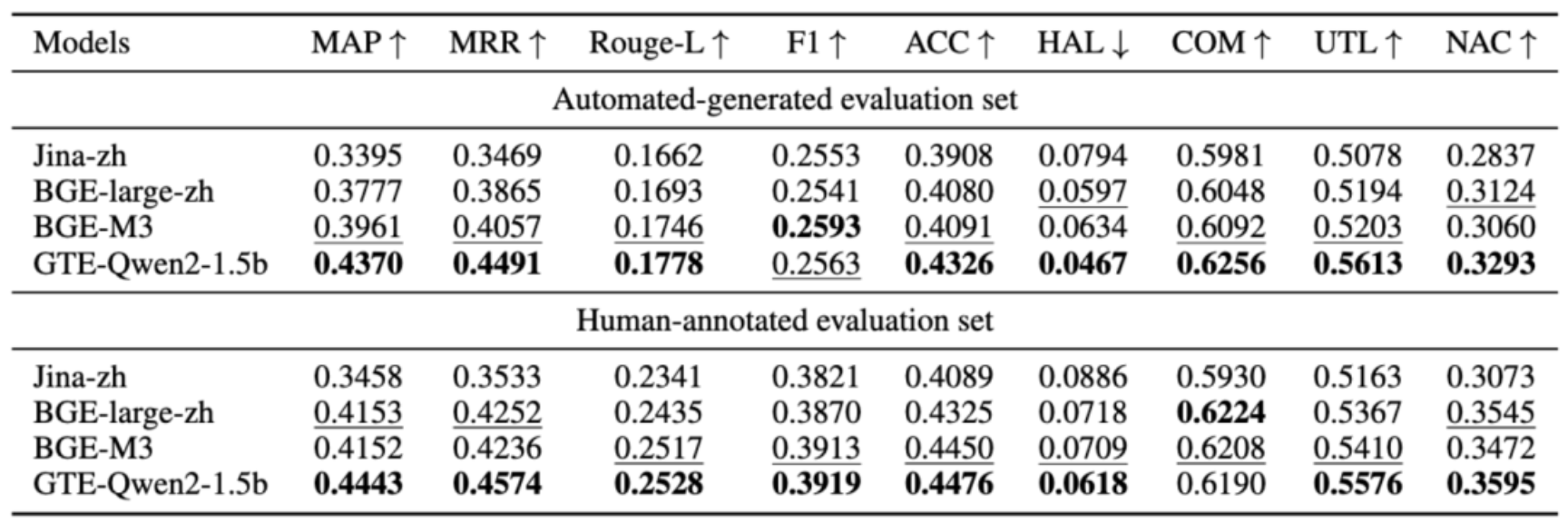 表4:以Qwen2.5 - 72B为生成器时检索模型的整体结果。展示了Jina - zh、BGE - large - zh、BGE - m3、GTE - Qwen2 - 1.5b等检索模型在MAP、MRR、ROUGE - L、F1等指标上的性能。